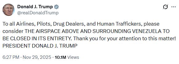 امریکی صدر ڈونلڈ ٹرمپ نے ایک غیر معمولی بیان دیتے ہوئے اعلان کیا ہے کہ وینزویلا کے اوپر اور اطراف کی فضائی حدود کو مکمل طور پر بند تصور کیا جائے۔ انہوں نے یہ تنبیہ نہ صرف ایئرلائنز اور پائلٹس کو دی بلکہ منشیات اسمگلنگ اور انسانی تجارت میں ملوث گروہوں کا خاص طور پر ذکر کیا۔ اس اعلان کے بعد بین الاقوامی سطح پر تشویش بڑھ گئی ہے کیونکہ فضائی حدود کی بندش عام طور پر کسی بڑے سفارتی یا عسکری اقدام سے قبل کی علامت سمجھی جاتی ہے، جس سے خطے میں بے چینی کی لہر دوڑ گئی ہے۔